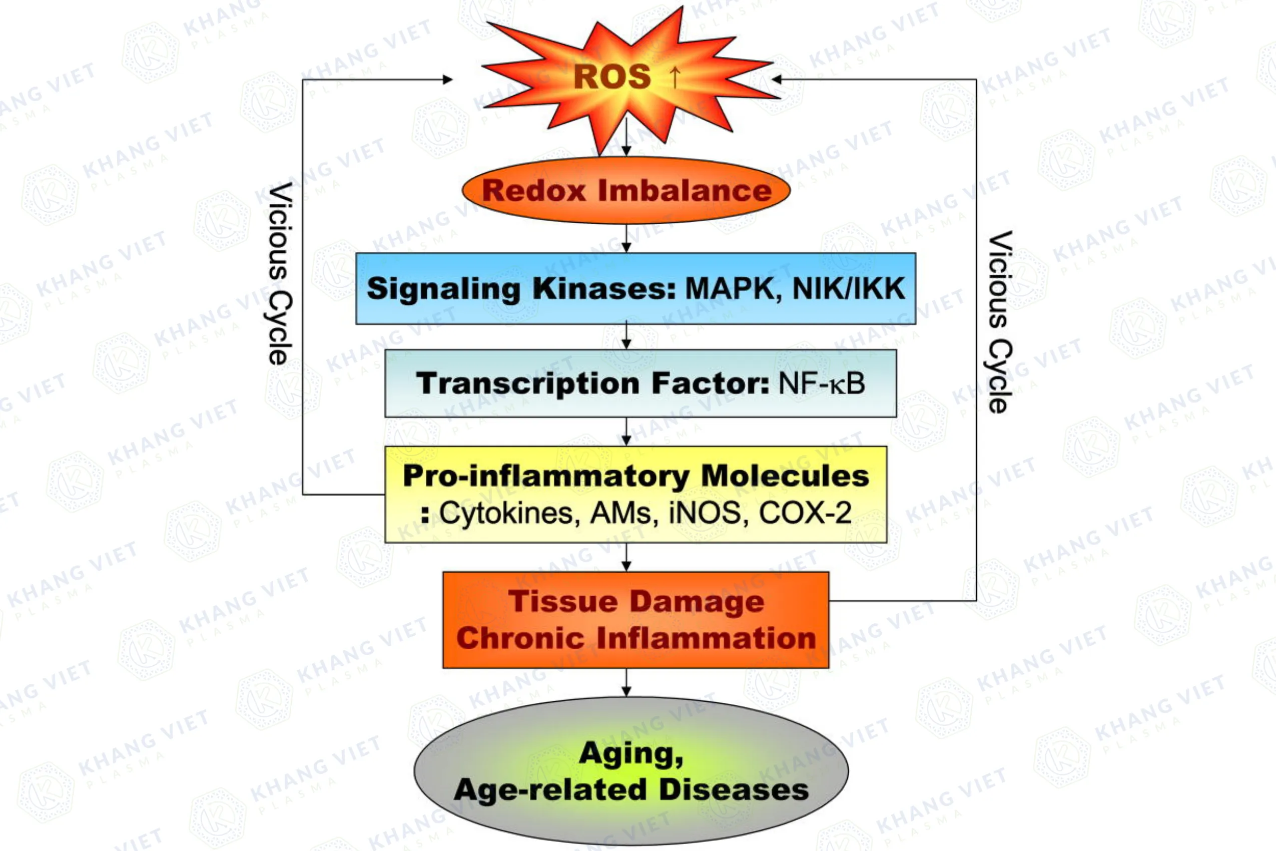 Sơ đồ minh họa vòng xoắn stress oxy hóa – viêm mạn tính dẫn đến lão hóa và các bệnh liên quan đến tuổi tác.